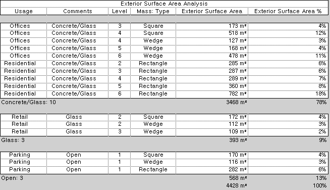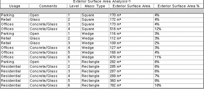 이 예에서는 계산 방법의 차이로 인해 매스 바닥 중 일부(사각형 레벨 4 및 쐐기 레벨 6)의 외부 표면적이 다른 매스 바닥의 외부 표면적보다 큽니다.