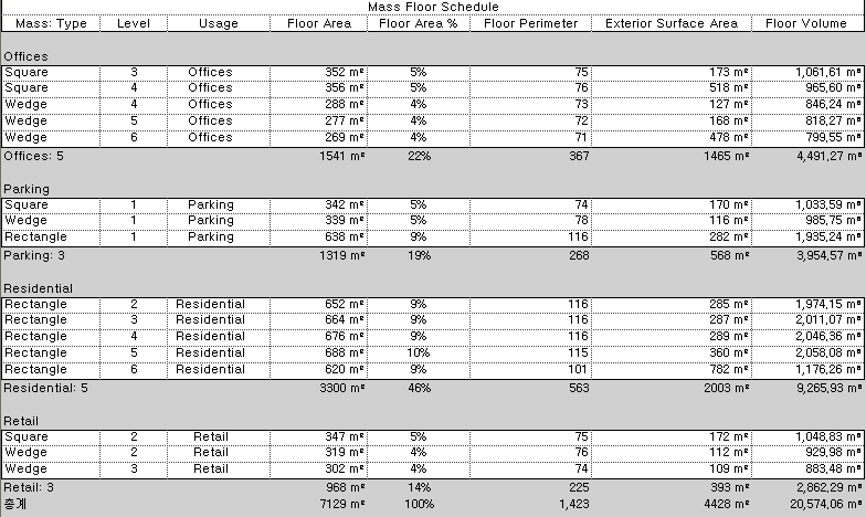 매스 바닥을 작성한 후 매스 바닥 일람표를 사용하여 용도를 지정하거나 설계를 해석합니다.