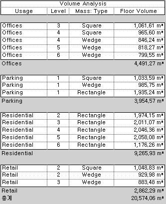 일람표에 각 매스 바닥의 체적, 용도별 체적 소계 및 매스 바닥의 결합된 체적 총계가 표시됩니다. 이 정보를 사용하여 각 매스 바닥에 계획된 용도에 따라 설계의 HVAC 로드를 추산합니다.
