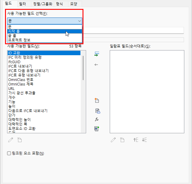 - 필드 탭의 사용 가능한 필드 선택 드롭다운에서 시작 룸이나 끝 룸을 선택합니다.