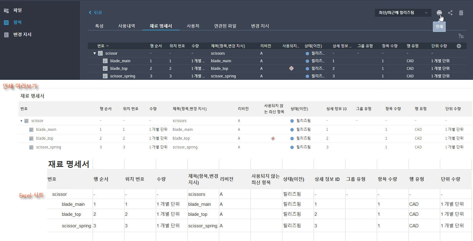 파일, 항목 또는 변경 지시 상세 정보 탭에서 인쇄 아이콘을 클릭합니다.