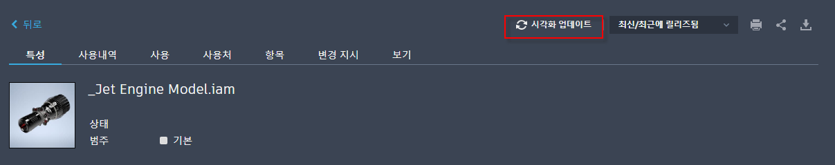 CAD 파일의 최신 DWF를 사용할 수 있도록 시각화 파일을 업데이트할 수 있습니다. 시각화 파일이 업데이트되면 작업은 처리를 위해 작업 서버로 전송됩니다. 시각화 파일 업데이트 명령은 작업 서버가 사용 가능하게 설정되고 켜진 경우에만 사용할 수 있습니다.