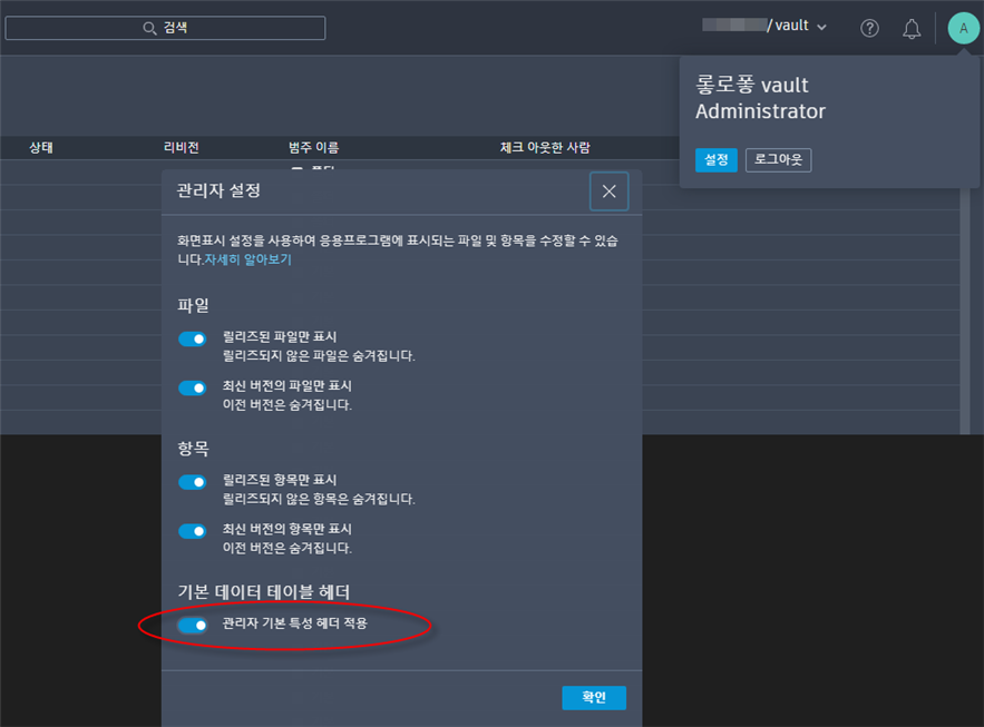 관리자는 필수 열을 구성하고 모든 사용자에 대해 동일한 열을 적용할 수 있습니다. 이 옵션이 적용되면 관리자가 아닌 사용자는 파일, 항목, 변경 지시 및 검색 작업공간에서 기본 열을 변경할 수 없습니다. 현재, 관리 정의 헤더는 검색 작업공간에 적용되지 않습니다.