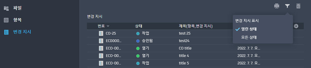 "열기 상태" 또는 "모든 상태" 필터를 선택합니다. 열기 상태 필터를 선택하면 닫힘 또는 취소됨 상태의 모든 변경 지시가 뷰에서 숨겨집니다.