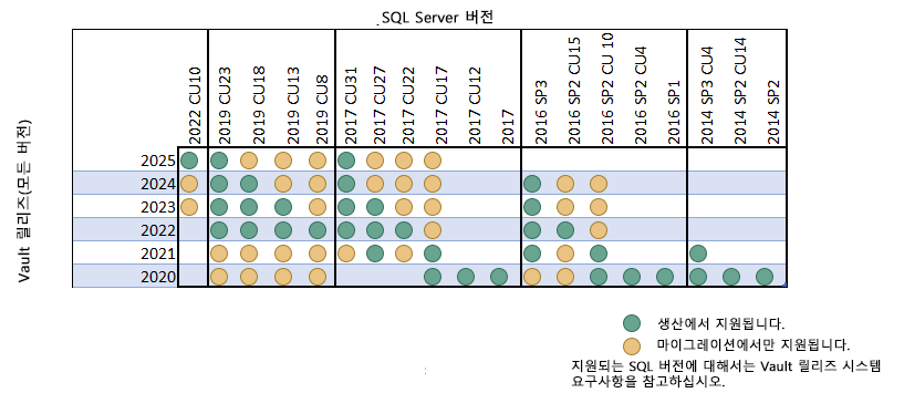 다음 차트에는 호환되는 Vault 및 SQL 릴리즈가 녹색 점으로 요약되어 있습니다. 노란색 점은 권장 업그레이드 경로입니다. Vault와 SQL 제품 버전 간의 호환성을 확인하려면 해당 Vault 릴리즈에 대한 Vault 시스템 요구사항을 참조하십시오.