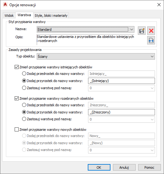 Zasady projektowania dotyczące przypisywania warstw mogą być modyfikowane poprzez typ obiektu i kategorię. Można określić, że zamiast zmiany nazwy warstwy do tej nazwy dołączany jest przedrostek lub przyrostek. Ustawienia te można zapisać w stylu przypisania warstwy wybranym w oknie dialogowym Opcje renowacji.