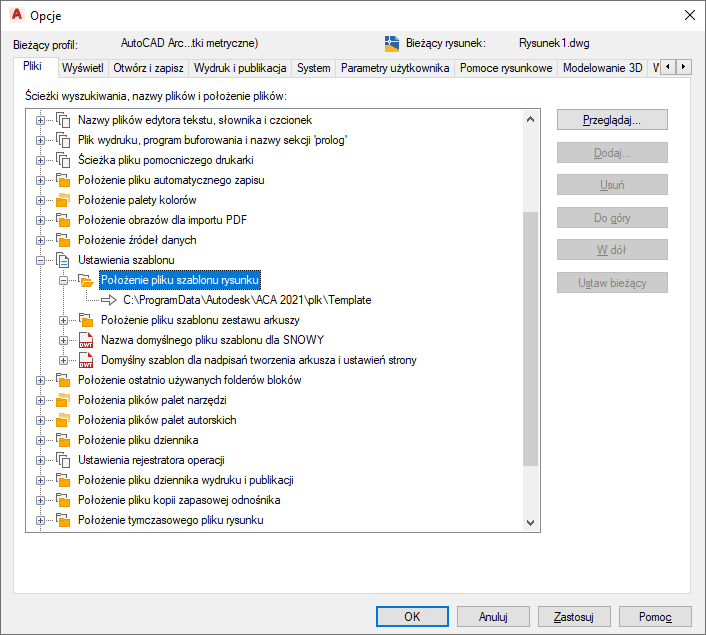 Konfigurowanie położenia pliku szablonu w oknie dialogowym „Opcje”.