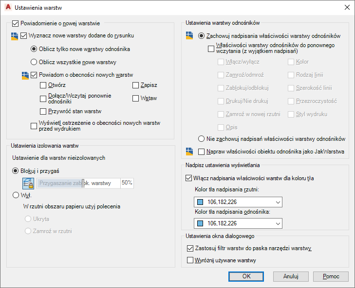 - Aby ustawić powiadamianie o nowych warstwach na rysunku, wybierz polecenie Wyznacz nowe warstwy dodane do rysunku.