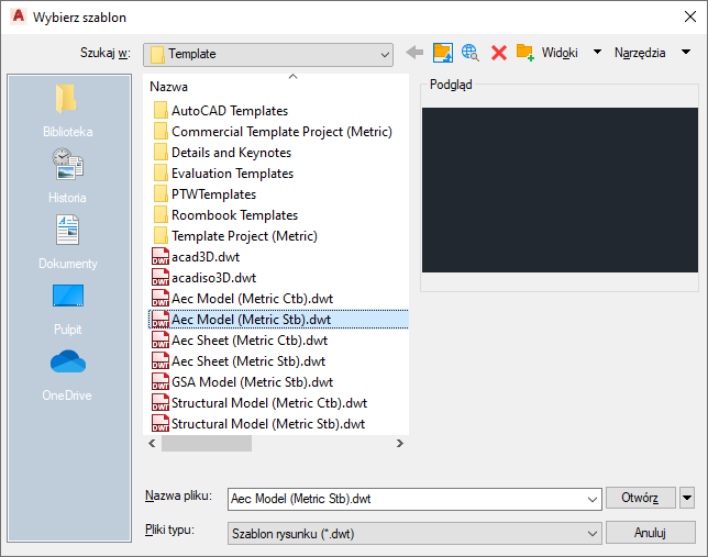 Szablony rysunków dostarczane wraz z programem znajdują się w folderze C:\ProgramData\Autodesk\ACA <wersja>\plk\Template. Pliki szablonów mają rozszerzenie DWT.