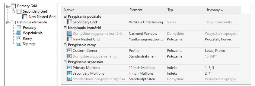 Do listy siatek w widoku struktury drzewa po lewej stronie okna dialogowego zostanie dodana nowa siatka. Jeśli edytowana jest siatka podstawowa, nowa siatka zostanie dodana na poziomie drugorzędnym. W przypadku edytowania siatki na poziomie drugorzędnym nowa siatka zostanie umieszczona na poziomie trzeciorzędnym itd.