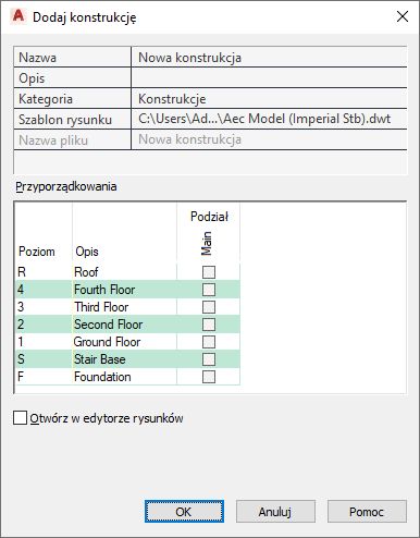 nadać nazwę nowej konstrukcji | wprowadź nazwę. Jeżeli jako nazwy plików projektu numery projektów używane są jako prefiks, nie ma potrzeby wprowadzania prefiksu. Pełna nazwa z prefiksem wyświetlana jest pod nazwą pliku. |