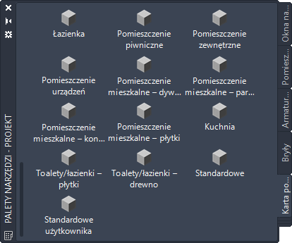 Paleta narzędzi Roombook zawiera różne style materiałów powierzchni. Polecenia są połączone z plikiem