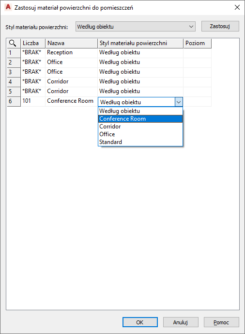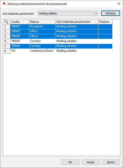 Wszystkie pomieszczenia na rysunku są wyświetlone w oknie dialogowym, z informacjami o numerze, nazwie i poziomie. Można edytować wyłącznie informacje o stylu materiału powierzchni.