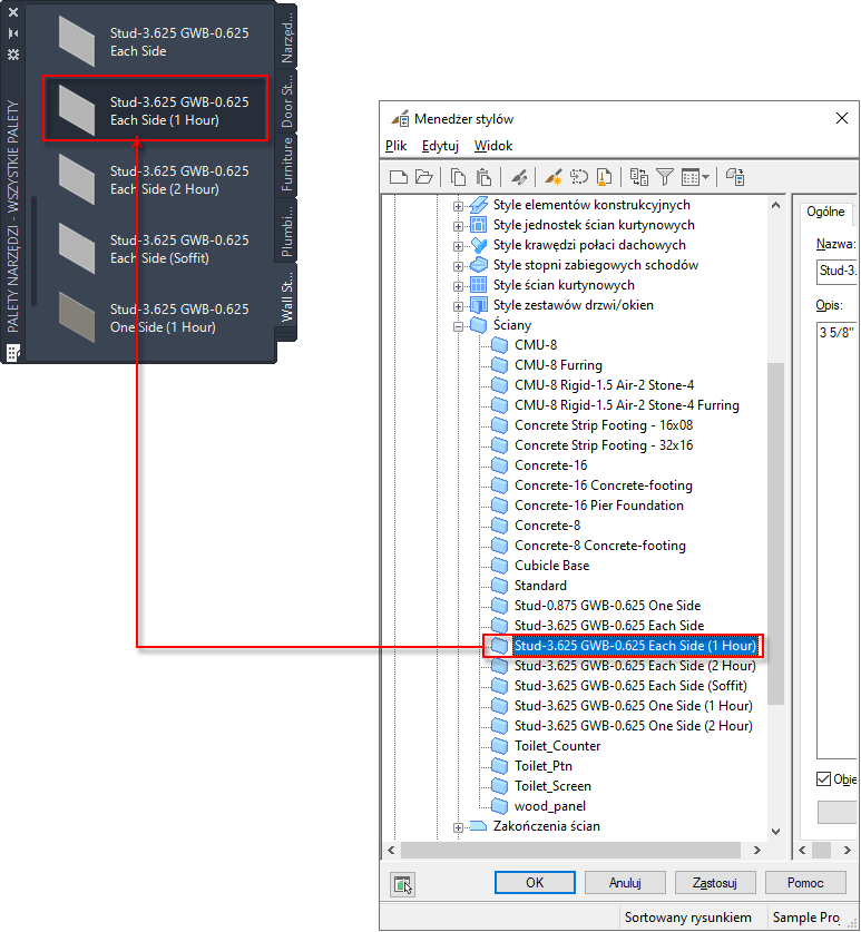 Jeżeli na przykład chcesz utworzyć narzędzie ściany ze stylem Stud-3.625 GWB-0.625 Each Side (1 Hour), rozwiń opcję Style ścian i wybierz styl Stud-3.625 GWB-0.625 Each Side (1 Hour).