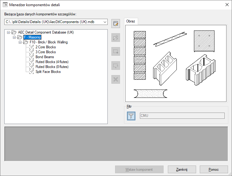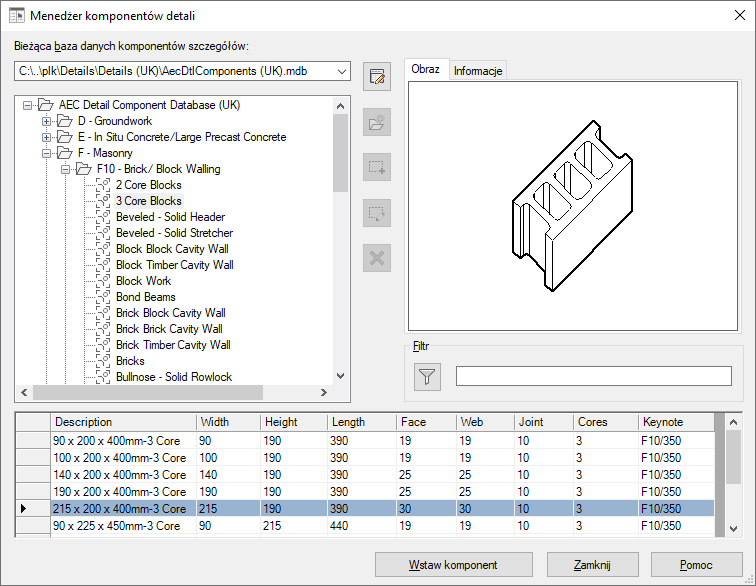 Okno dialogowe Menedżer komponentu szczegółu z wyświetloną tabelą betonowych elementów murarskich