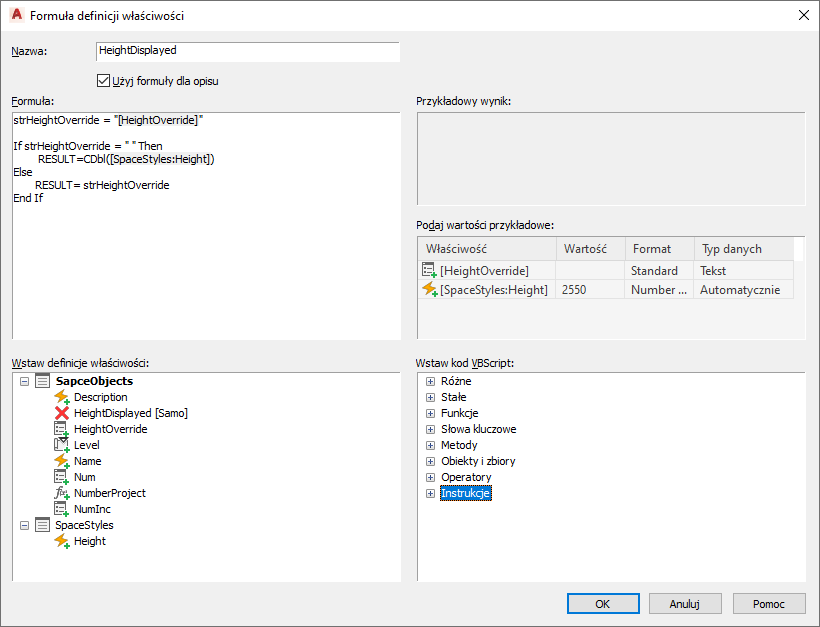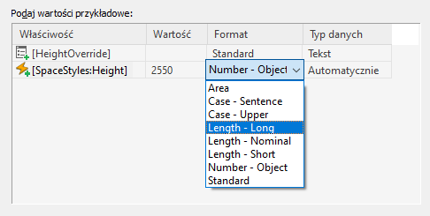 Po wstawieniu definicji właściwości po raz pierwszy do formuły wartość przykładowa jest pobierana z aktualnego rysunku, z obiektu, który używa definicji zestawu właściwości formuły lub z obiektu domyślnego.