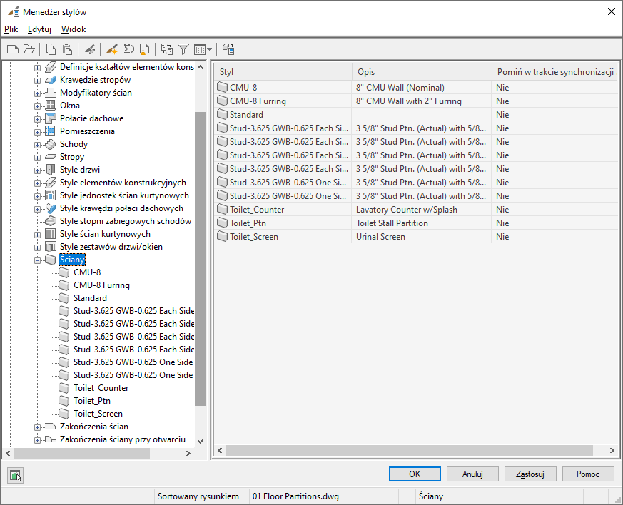 Style zorganizowane są w 3 kategorie: Obiekty architektoniczne, np. Style drzwi; Obiekty dokumentacji, np. Style tabel zestawieniowych oraz Obiekty uniwersalne, np. Style kluczy warstw. W każdej kategorii style wyświetlane są alfabetycznie. Aby przefiltrować widok drzewa w taki sposób, aby wyświetlić style tylko jednego typu, wybierz typ stylu i na pasku narzędzi Menedżer stylów kliknij . Aby ponownie wyświetlić wszystkie style, kliknij ponownie przycisk
