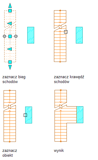 Długość schodów zostanie zwiększona przy zachowaniu pierwotnej szerokości, jeśli obiekt (lub polilinia) nie jest wydłużona na tyle, aby rzutowanie było kompletne.
