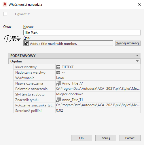 Klucz warstwy | Ogólne | Domyślnie znacznik tytułu skojarzony z narzędziem znaczników opisowych wstawiany jest na tej samej warstwie, co utworzony widok obszaru modelu. Jednak istnieje możliwość zdefiniowania innej warstwy dla znacznika tytułu poprzez wybranie w tym miejscu innego klucza warstwy. |