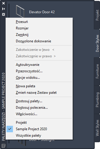 W zależności od ustawienia lokalizacji pliku palet narzędzi, grupa palet narzędzi projektu może być wyświetlana automatycznie po ustawieniu bieżącego projektu i zamknięciu przeglądarki projektu lub może być pusta i niewyświetlana w zestawie palet narzędzi. Grupa palet narzędzi projektowania wyświetlana jest automatycznie, jeśli zawiera przynajmniej jedną paletę.
