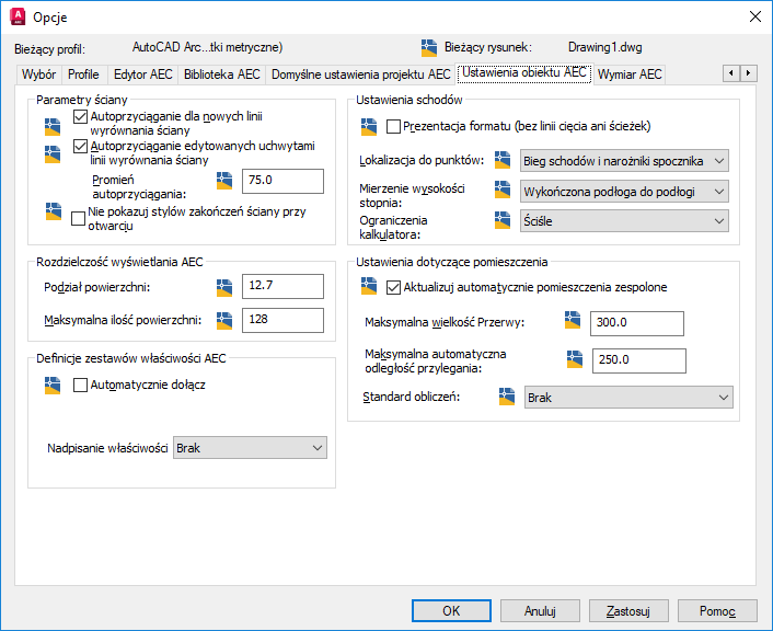 Wskazówka: Można również ustawić normę obliczania powierzchni, wprowadzając w wierszu polecenia aecspacecalculationstandard.