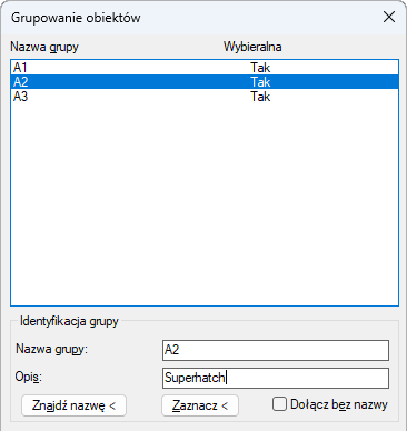 3) Wybierz grupę. Zwróć uwagę, że w polu opisu grup utworzonych poleceniem SUPERHATCH wyświetlany jest napis „superhatch” (superkreskowanie).