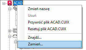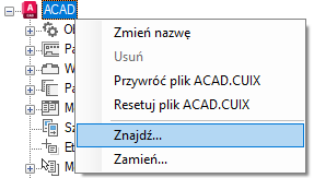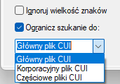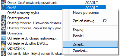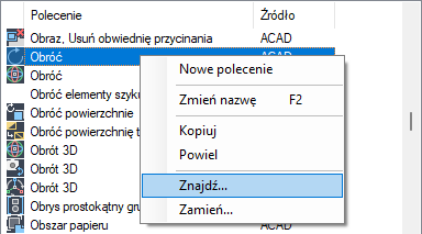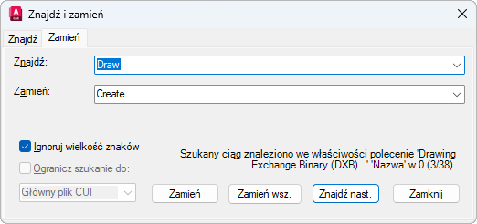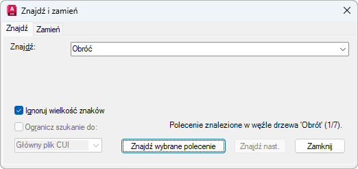 Zostanie wyświetlony komunikat, który określa lokalizację polecenia, jego dokładne położenie w panelu Dostosowywanie w lub panelu Właściwości oraz liczbę jego wystąpień.