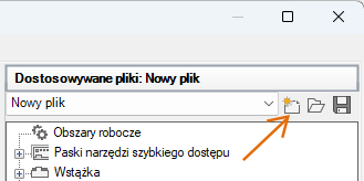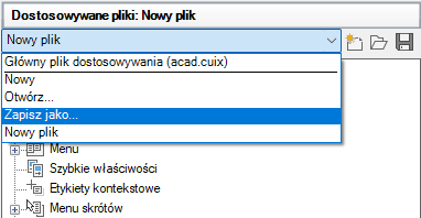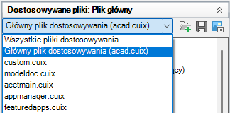 Wszystkie nowe polecenia są bezpośrednio dodawane do roboczego pliku CUIx. Jeśli plik CUIx, który zostanie użyty, nie został wczytany, na liście rozwijanej Pliki dostosowywania kliknij przycisk Otwórz. Następnie wybierz plik CUIx, który chcesz używać.