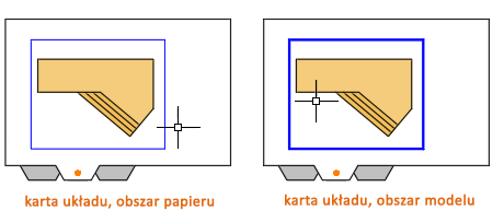 Podczas pracy na karcie układu można przełączać się między obszarem papieru a obszarem modelu bez powracania do karty Model. Oto jak to zrobić. Zgodnie z ilustracją przesuń kursor i kliknij dwukrotnie wewnątrz rzutni układu, aby uzyskać dostęp do obszaru modelu lub kliknij dwukrotnie na zewnątrz rzutni układu, aby powrócić do obszaru papieru. Jeśli użytkownik pracuje w obszarze modelu, obramowanie rzutni układu staje się grubsze.