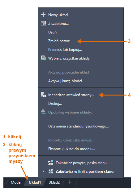 Pierwszą czynnością, którą powinno się wykonać po przejściu na kartę układu (1) jest kliknięcie jej prawym przyciskiem myszy (2) i zmiana jej nazwy (3) na bardziej szczegółową niż Układ 1. Dobry wybór mogą stanowić nazwy odnoszące się do określonego rozmiaru ANSI lub ISO.