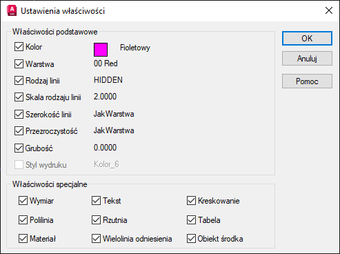 Właściwości specjalne umożliwiają zastosowanie właściwości specyficznych dla typu obiektu źródłowego. W przypadku obiektów wymiarów jest to styl wymiarowania i inne.