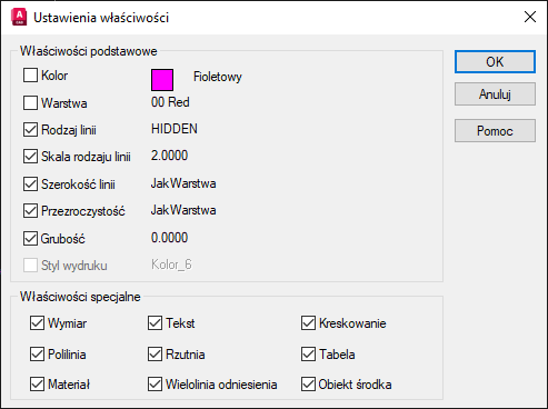 Podczas używania polecenia UZGWŁAŚCIWOŚCI pomiędzy rysunkami na rysunku zostaną utworzone wszystkie wymagane style lub definicje. Mogą to być: