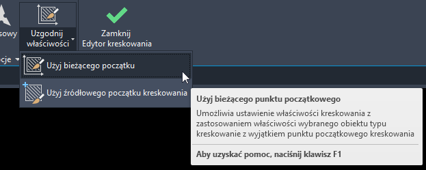 Podczas kopiowania właściwości z jednego obiektu kreskowania do innego z wykorzystaniem polecenia UZGWŁAŚCIWOŚCI zostaną skopiowane również współrzędne początku kreskowania. Aby uniknąć kopiowania początku, należy wykonać poniższe czynności.