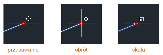 Uwaga: Etykiety kursora wskazują, kiedy aktywne są tryby uchwytów przesuwania, obracania lub skalowania, ale nie rozciągania ani odbijania.