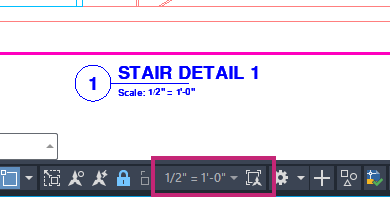 W rzutni z etykietą STAIR DETAIL 1 powinien być widoczny nowy obiekt WTekst, ponieważ przypisano mu skalę 1/2"=1'-0". Ten tekst nie będzie wyświetlany w rzutni STAIR SECTION 1, ponieważ przypisano jej skalę 1/4"=1’-0".