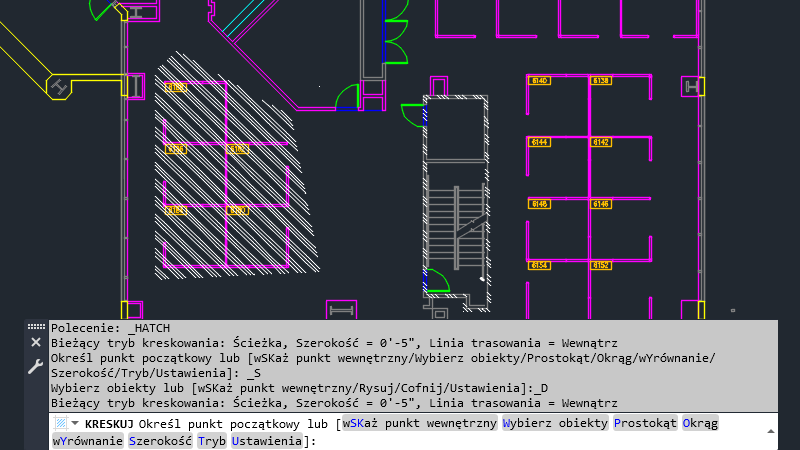 - KRESKUJ — wypełnia obszar zamknięty lub wybrane obiekty wzorem kreskowania, pełnym wypełnieniem lub wypełnieniem gradientowym.