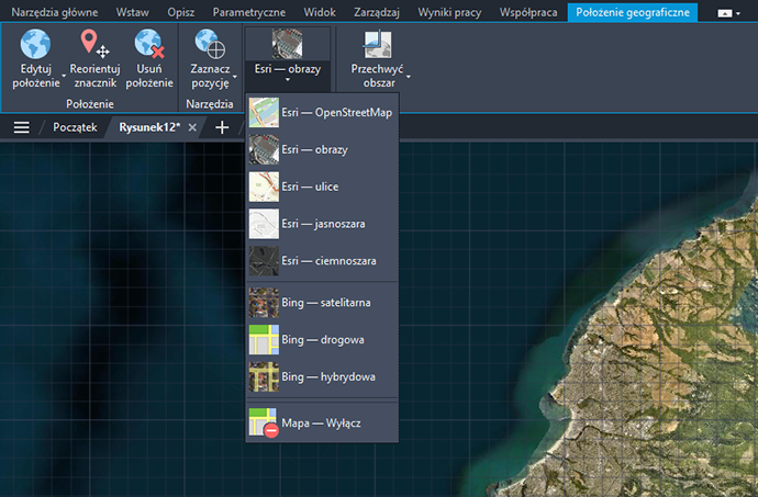 Dostępnych jest pięć nowych map firmy Esri umożliwiających przypisanie informacji o położeniu geograficznym do rysunków.
