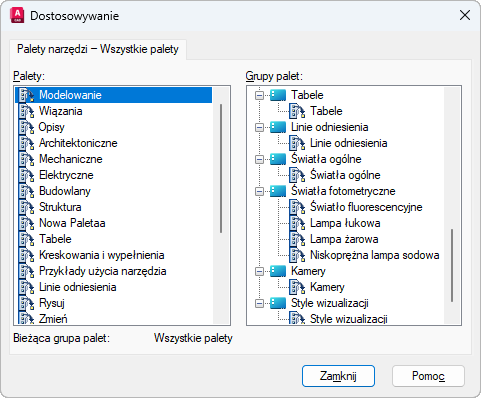 Wyświetla listę wszystkich dostępnych palet narzędzi.