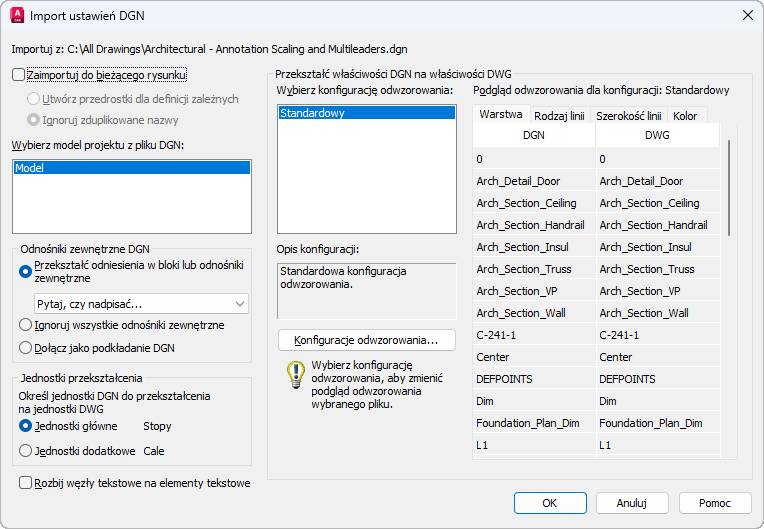 Standardowa to domyślna konfiguracja odwzorowania, która wyodrębnia dane z eksportowanego rysunku i stosuje automatyczne odwzorowanie na warstwy DGN, rodzaje linii, szerokości linii oraz kolory, co jest widoczne na podglądzie odwzorowania.