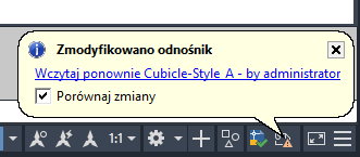 Po dołączeniu odnośników zewnętrznych do rysunku program sprawdza co jakiś czas, czy pliki, do których prowadzą odniesienia, uległy zmianom od ostatniego wczytania odnośników zewnętrznych. Powiadamianiem o odnośnikach zewnętrznych steruje zmienna systemowa XREFNOTIFY.