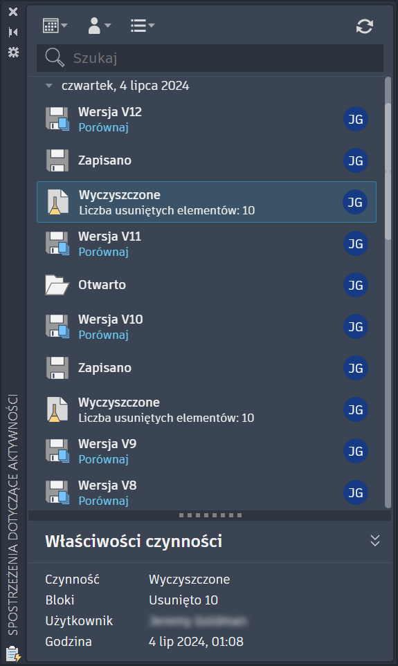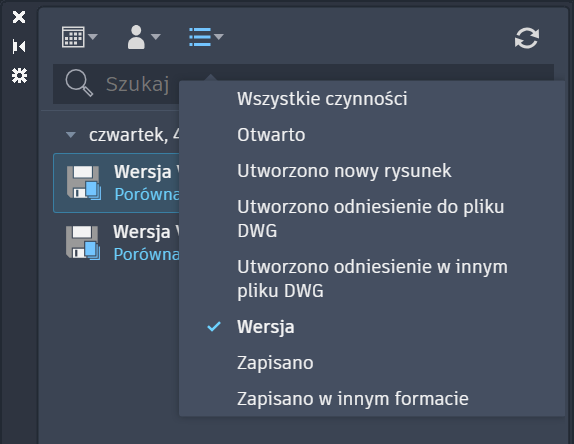 Uwaga: Lista aktywności jest aktualizowana przy każdym zapisie rysunku.