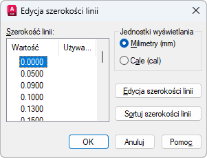 Określa jednostki, w jakich jest wyświetlana lista szerokości linii.
