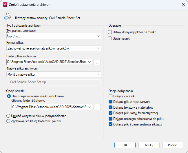 Włącza do pakietu archiwum pliki z danymi zestawu arkuszy (DST), pliki rysunkowe z blokami etykiet, pliki rysunkowe z blokami objaśnień oraz pliki szablonów rysunkowych (DWT).