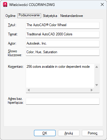 Zakładka Podsumowanie (okno dialogowe Właściwości rysunku)