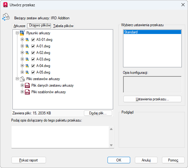 Domyślnie wyświetlane są wszystkie pliki skojarzone z bieżącym rysunkiem (zależne odnośniki, style wydruku i czcionki). Możesz dodać pliki do pakietu przekazu lub usunąć z niego pliki istniejące. Pliki skojarzone przez URL nie są umieszczane w zbiorze przekazu.