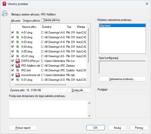 Domyślnie wyświetlane są wszystkie pliki skojarzone z bieżącym rysunkiem (zależne odnośniki zewnętrzne, style wydruku i czcionki). Możesz dodać pliki do pakietu przekazu lub usunąć z niego pliki istniejące. Pliki skojarzone przez URL nie są umieszczane w zbiorze przekazu.