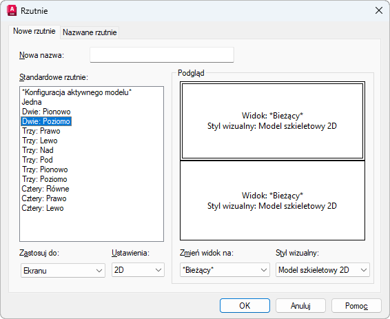 Określa ustawienia 2D lub 3D. Gdy zostanie wybrana opcja 2D, nowa konfiguracja rzutni jest początkowo tworzona przy użyciu bieżącego widoku we wszystkich rzutniach. Gdy zostanie wybrana opcja 3D, zestaw standardowych ortogonalnych widoków 3D zostanie zastosowany do rzutni w konfiguracji.