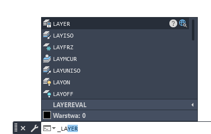 Niektóre polecenia mają skrócone nazwy, czyli aliasy poleceń, które można wpisywać w wierszu polecenia. Zamiast na przykład wprowadzać ciąg okrąg w celu uruchomienia polecenia OKRĄG, można wpisać znak o i nacisnąć klawisz Enter. Na liście propozycji poleceń (jeśli jest wyświetlana) alias znajduje się przed nazwą polecenia: O (OKRĄG)