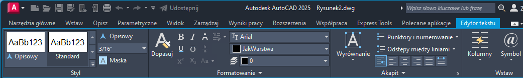 Po wybraniu określonego typu obiektu lub rozpoczęciu niektórych poleceń zostanie wyświetlona kontekstowa karta wstążki zamiast paska narzędzi bądź okna dialogowego. Karta kontekstowa jest zamykana po zakończeniu polecenia.