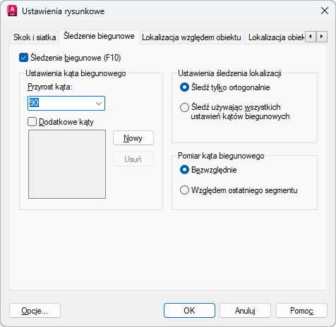 Ogranicza ruch kursora do określonych kątów biegunowych. (zmienna systemowa AUTOSNAP)
